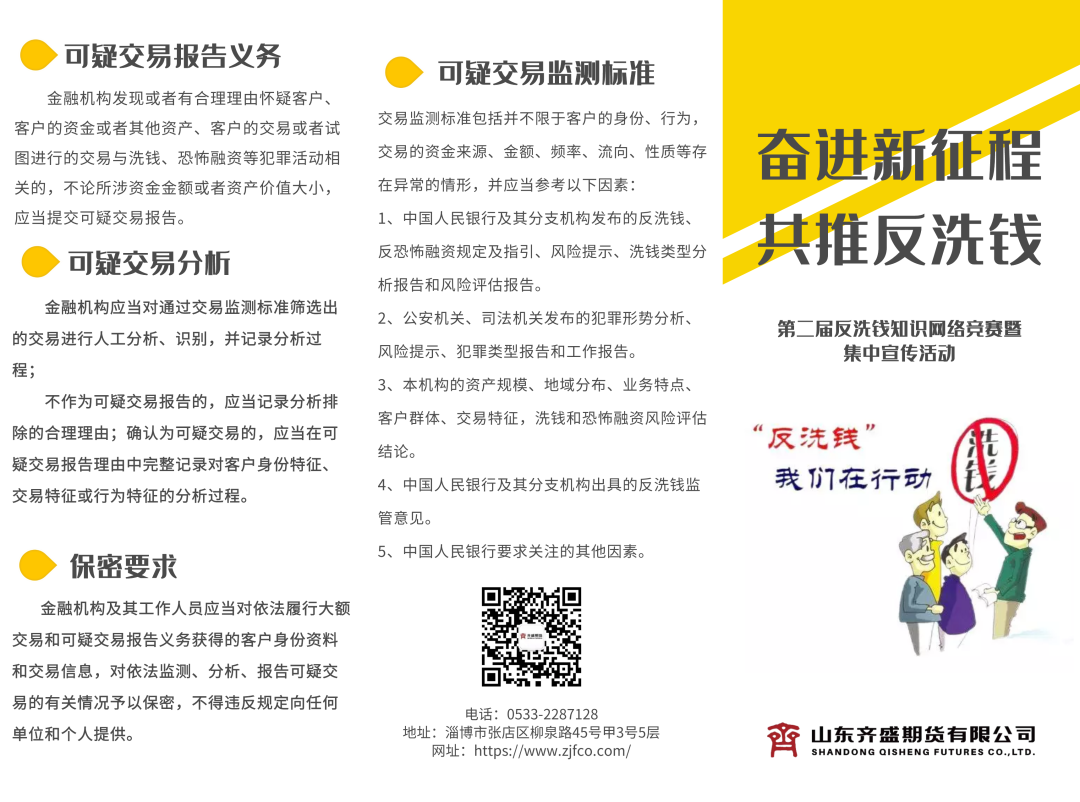 “反洗钱”我们在行动。此次活动,集团公司法务风控部联合齐盛期货公司通过多形式、全方位向社会公众讲解洗钱过程、洗钱危害、反洗钱的意义等,以生动的形式向社会公众展示洗钱案例,向投资者揭示洗钱风险,不断提升了公众对反洗钱的认知,不断提升了员工反洗钱意识。